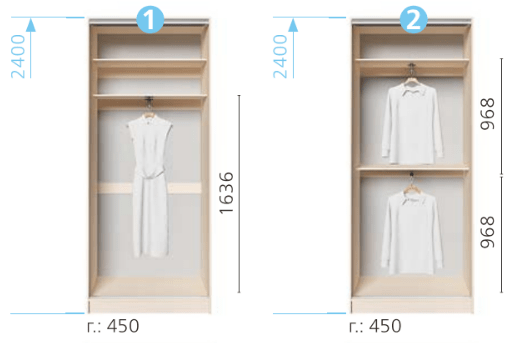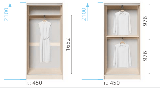 Габарити шафи можна змінювати по ширині. У цій моделі ширина шафи може бути від 900 до 1200 мм. Глибина шафи може бути 450/600 мм Висота шафи виконується 2400/2200/2100 мм.