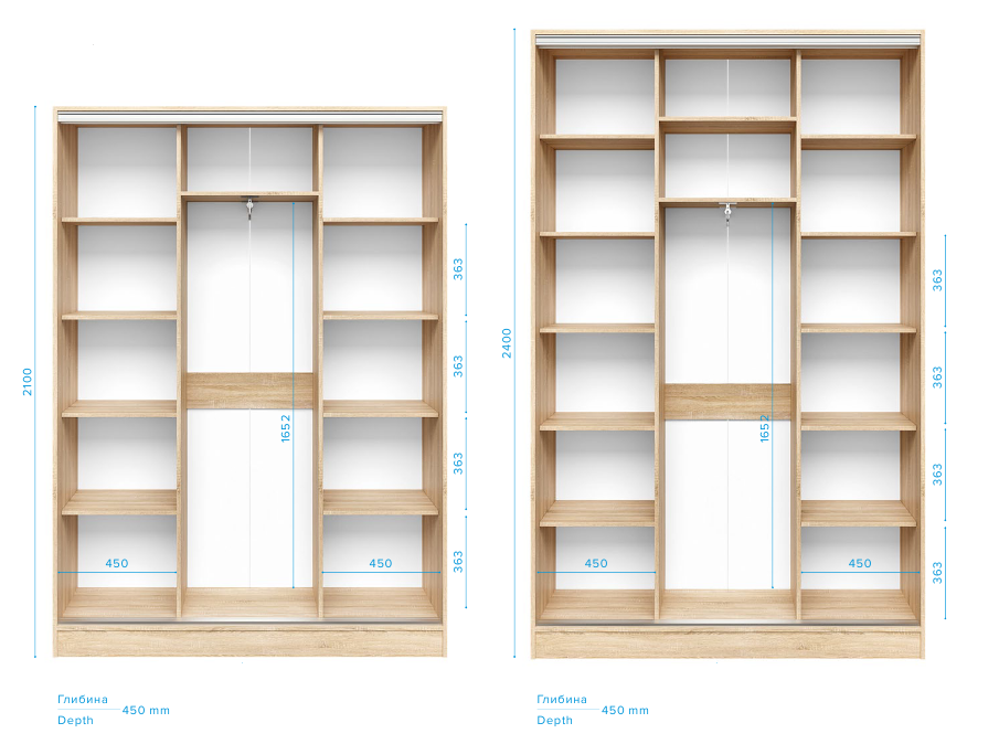 Габарити шафи можна змінювати по ширині. У цій моделі ширина шафи може бути від 1800 до 2700 мм. Глибина шафи може бути 450/600 мм Висота шафи виконується 2400/2200/2100 мм. Також у шафу є можливість встановлювати висувні шухляди.