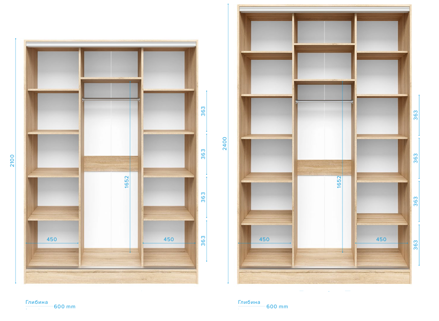 Габарити шафи можна змінювати по ширині. У цій моделі ширина шафи може бути від 1800 до 2700 мм. Глибина шафи може бути 450/600 мм Висота шафи виконується 2400/2200/2100 мм. Також у шафу є можливість встановлювати висувні шухляди.