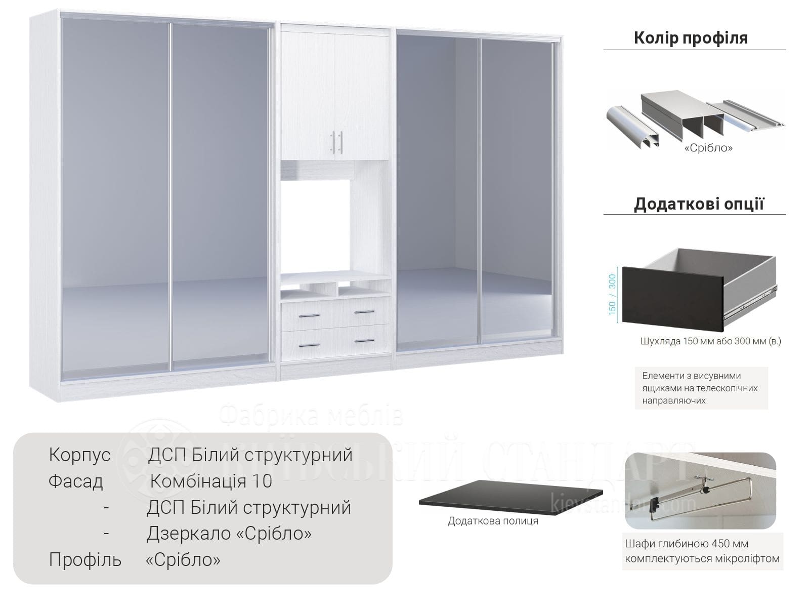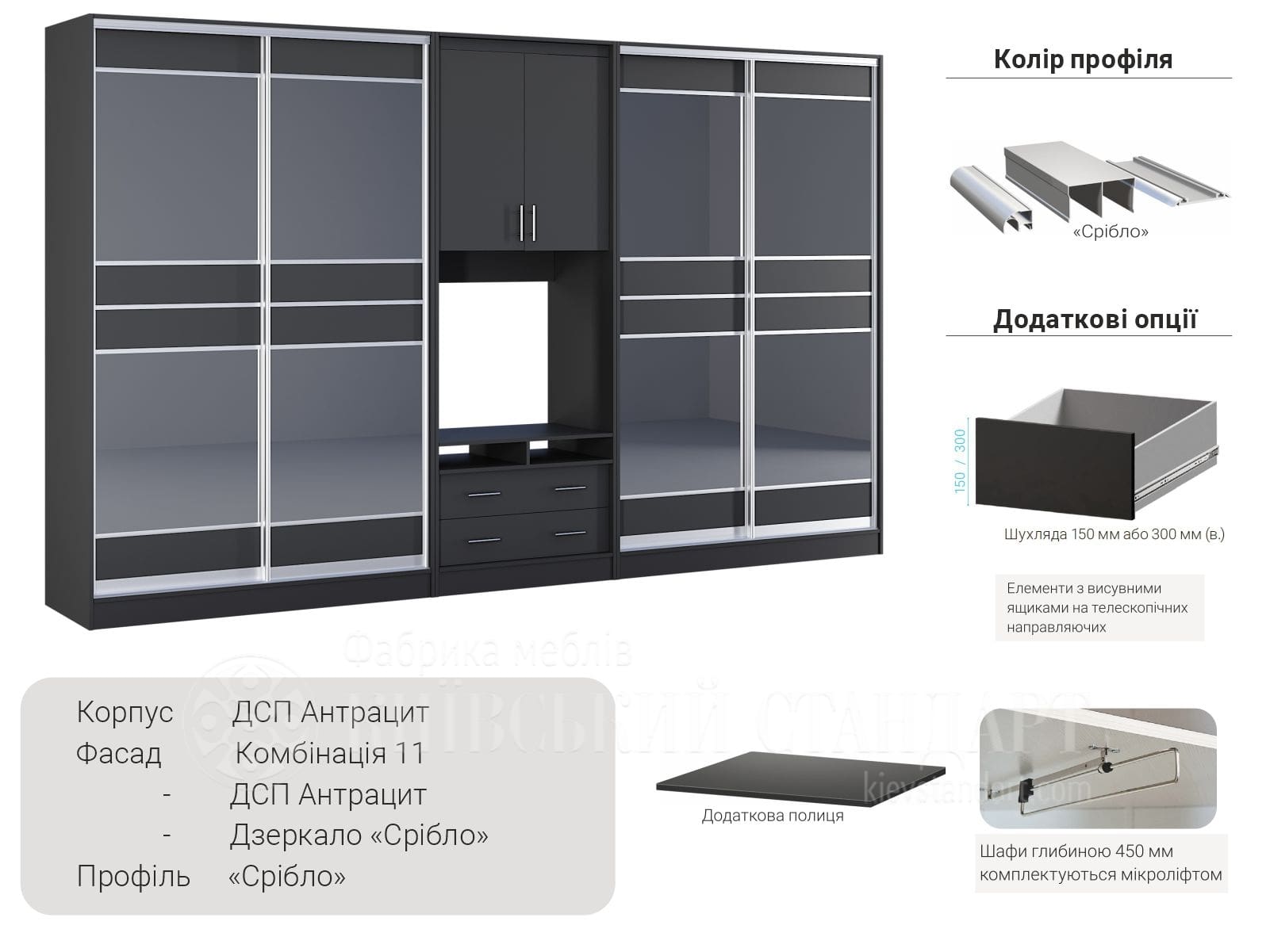 На вибір пропонується 14 варіантів кольорів ДСП і так само величезний вибір розсувних дверей, дзеркало, художнє матування, фотодрук і варіанти комбінацій з усіма цими матеріалами.
